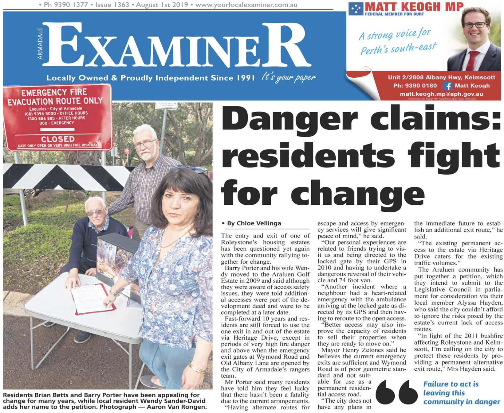 The former Member for Darling Range, Alyssa Hayden MLA, encouraged the City of Armadale (“the City”) to review its decision not to consider and accommodate a request by the residents at the Araluen Golf Resort to establish an additional entrance to and exit point from the estate.